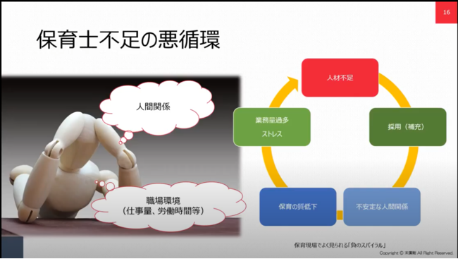 ・保育士不足の悪循環|人材不足→採用(補充)→不安定な人間関係→保育の質低下→業務量過多、ストレス