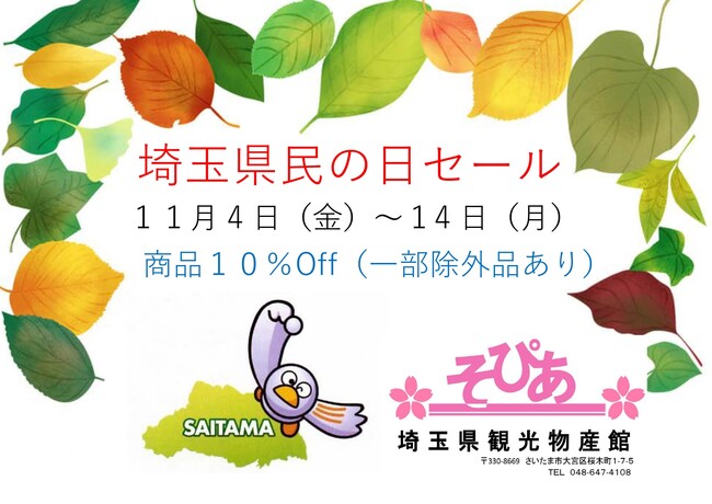 埼玉県物産観光館「そぴあ」では、11月14日(月)の県民の日の前9日間を「埼玉県民の日セール」と銘打って、埼玉を代表するおみやげ品を全品10%OFF(一部除外品あり)で販売いたします。