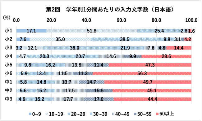 第2回調査では基準となる60文字/分以上入力できる児童生徒が全学年で増加し、小学5年生以上の全ての学年で4割を超えていることが明らかになりました。