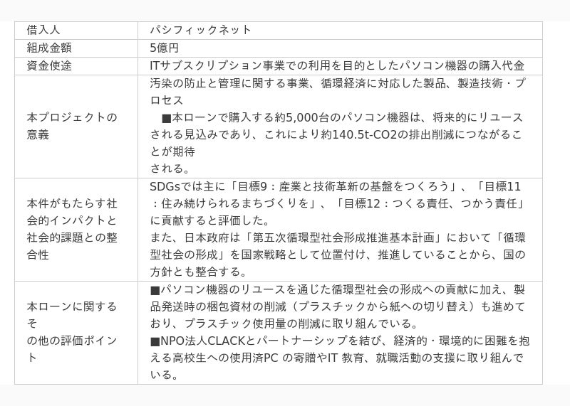株式会社パシフィックネット(本社:東京都港区、代表取締役社長:上田 雄太、以下 当社)は、株式会社SBI新生銀行(本社:東京都中央区、代表取締役社長:川島 克哉、以下 SBI新生銀行)との間で、ITサブスクリプション事業におけるパソコン機器の購入にかかる資金について、2024年9月26日に「新生グリーンローン」※(以下 本ローン)の契約を締結いたしました。