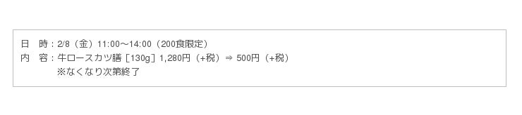 【1日限定】2/8(水)は、話題の牛カツが500円で食べられる行列必至のプレイベントも開催!