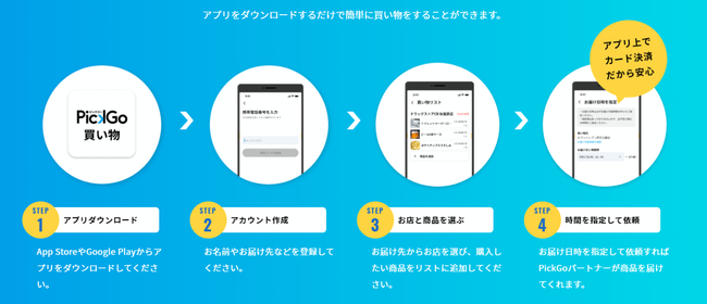 「PickGo 買い物」は、買い物を依頼したい人と、買い物から配送までできる人を繋ぐマッチングサービスです。利用者は欲しいものを必要な時にアプリで注文するだけで、指定の場所に軽貨物または二輪車の配送パートナーが即日お届けいたします。自宅にいながら、仕事をしながら、家事や育児の隙間時間にオーダーすることで、あなたの時間を効率的に使うことが可能になります。また、連携店以外のどんな店舗でもお届け先から半径20km圏内であればオーダーが可能です。配送パートナーの大半が軽貨物車両で対応するので、例えば欲しい家具や家電など車でないと買えないものも、即日ご自宅まで配送いたします。実際に利用した98.0%?1のお客様に「満足」または「非常に満足」と回答いただいています。