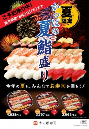 また、人気のネタを集めた夏季特別テイクアウトメニュー『かっぱの夏鮨盛り』も期間限定で販売いたします。ご家族・ご親戚で、またはご友人同士で、お寿司を囲んで楽しいひと時をお過ごし下さい。