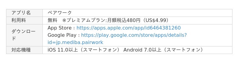 Google Play:https://play.google.com/store/apps/details?id=jp.mediba.pairwork