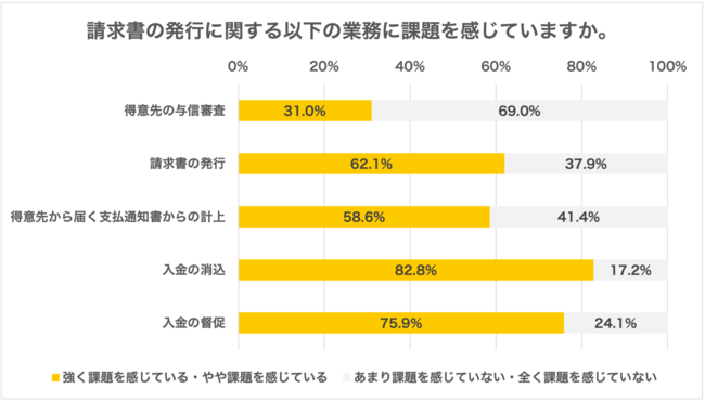 株式会社Deepworkが行った調査(※3)によると、62.1%の経理担当者が請求書の発行に課題を感じ、とりわけ請求書を発行した後の入金の消込には82.8%と大半の経理担当者が課題を感じています。