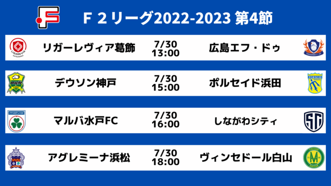 7月30日(土)に開催するFリーグ2022-2023 ディビジョン2 第4節の4試合を、以下のとおりELEVENにてライブ配信いたします!無料でご視聴いただけますので、ELEVENのアプリをダウンロードいただき、ぜひご視聴ください!