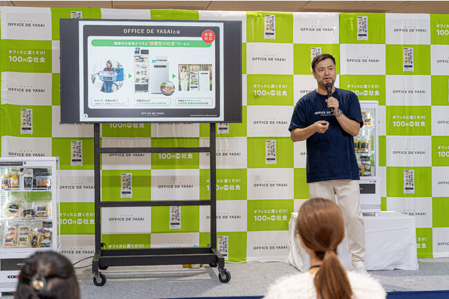 「2022年10月に福岡県糟屋郡に製造・物流の拠点を設けたことで、関東で製造していた頃よりも早く、より新鮮なサラダやフルーツを届けることができるようになり、サービスの質も向上しました。天神エリアは“ランチ難民“が多いという課題を耳にしたこともあり、当社のサービスがお役に立てる企業様も多いのではないかと考えています。また、福岡県で製造しているサラダに使われている野菜は、約70%が九州エリアの野菜です。現在、製造・物流拠点は福岡県をはじめ全国に6箇所ですが、今後も物流拠点と製造拠点を同地域で開拓することで、地産地消モデルを加速させていきます」と熱く語りました。