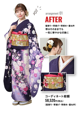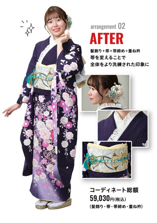 振袖レンタルフルセットを10万円以下でお手に取っていただくこともできるほか、新品小物12点はレンタルをご成約の方全員に無料でプレゼント。さらに、ご成約金額に応じて『前撮り撮影、ヘア・メイク&着付け』、 『成人式当日のヘア・メイク&着付け』の成人式安心プランまで付く、大変お得な企画です。