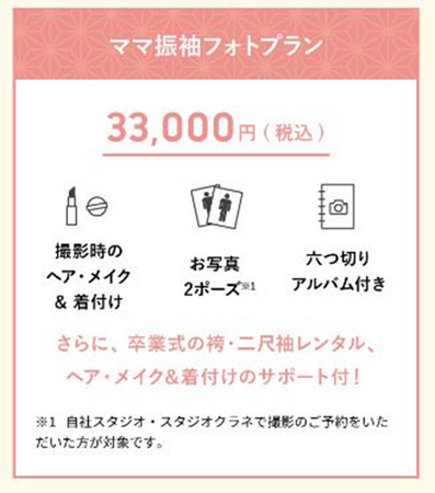 前撮り記念写真付きのプラン『ママ振袖フォトプラン』もご用意。京都きもの友禅だからできる、お得なセールをお見逃しなく。