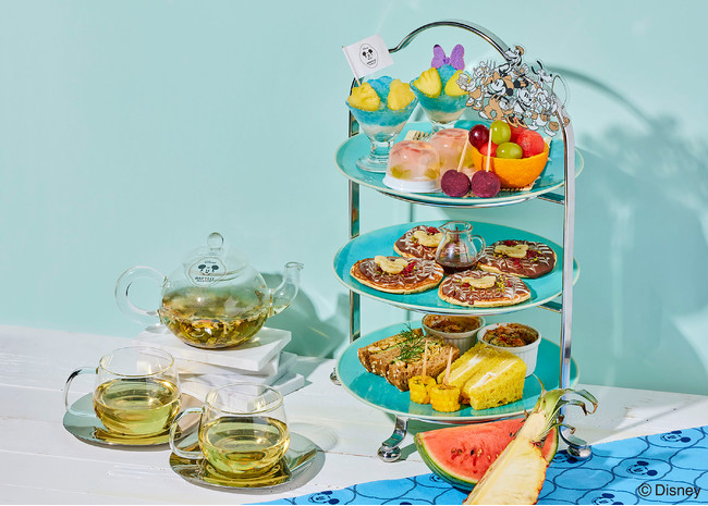 「ミッキー&フレンズが楽しむ“夏祭り”」をイメージした季節限定アフタヌーンティーセット。きれいな水色のカップルかき氷、金魚すくいをイメージしたゼリー、まるでお好み焼きみたいなチョコバナナのオートミールパンケーキなど、ワクワクする夏気分を盛り上げるスペシャルメニューです。