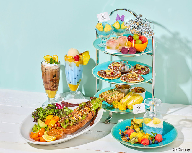 「ミッキー&フレンズが楽しむ“夏祭り”」をイメージした季節限定アフタヌーンティーセットをはじめ、南の島のビーチをイメージした夏ならではのひんやりプレート、全粒粉のパンでスパイシーなチキンをサンドしたお耳付きのホットドック、2種類の冷たいデザートドリンクもご用意いたします。