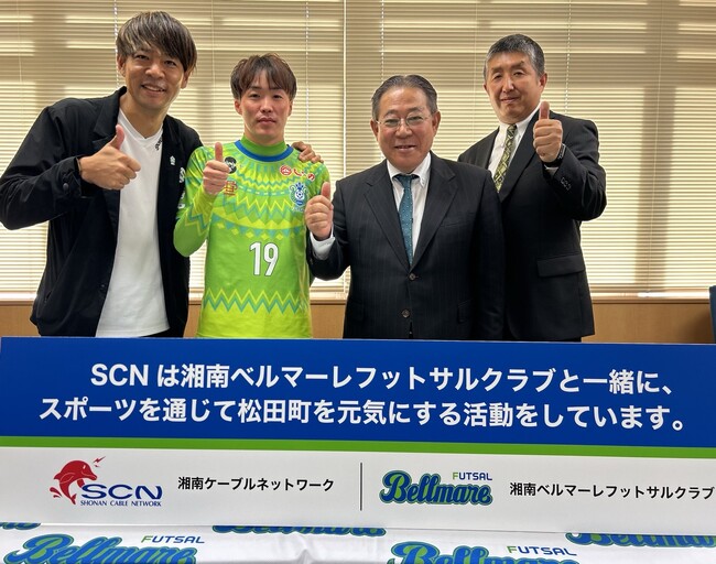 【写真左より湘南ケーブルネットワーク株式会社太田専務、柏手社長、松田町本山町長、湘南ベルマーレフットサルクラブ佐藤社長、山崎選手】