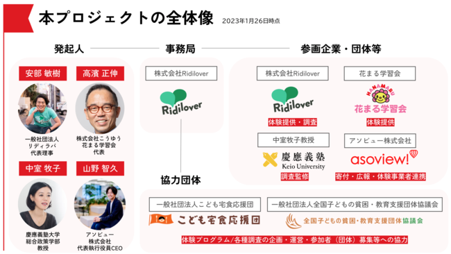 株式会社Ridilover(所在地:東京都文京区、以下:リディラバ)代表取締役 安部敏樹、アソビュー株式会社(所在地:東京都品川区、以下:アソビュー)代表執行役員CEO 山野智久、株式会社こうゆう(所在地:埼玉県さいたま市、以下:花まる学習会)代表:高濱正伸、ならびに慶應義塾大学 総合政策部 中室牧子教授は、2023年1月26日(木)、「子どもの体験格差解消プロジェクト」を発足いたします。