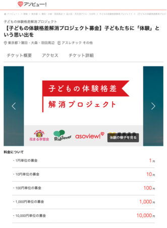 アソビュー!内寄付受付専用ページ「【子どもの体験格差解消プロジェクト募金】子どもたちに「体験」という思い出を」:https://www.asoview.com/item/ticket/ticket0000017950/