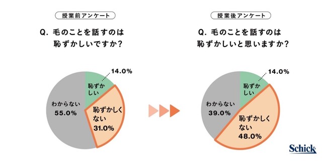 「MY FIRST SHAVE」の授業を行なった渋谷区立加計塚小学校の4年生児童44名に対して、授業前と授業後に体毛に関するアンケートを実施しました。授業前後の児童の意見から、体毛の知識やケア方法を伝えた出張授業の成果としてポジティブな結果が浮かび上がりました。