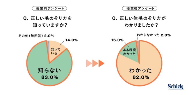 授業後は、体毛の正しいそり方がわかったと答える児童の割合は84ポイントもアップ