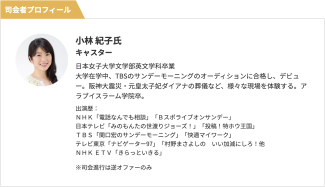 ■Pre-Eventの司会を努めるのはキャスターの小林 紀子 氏!
