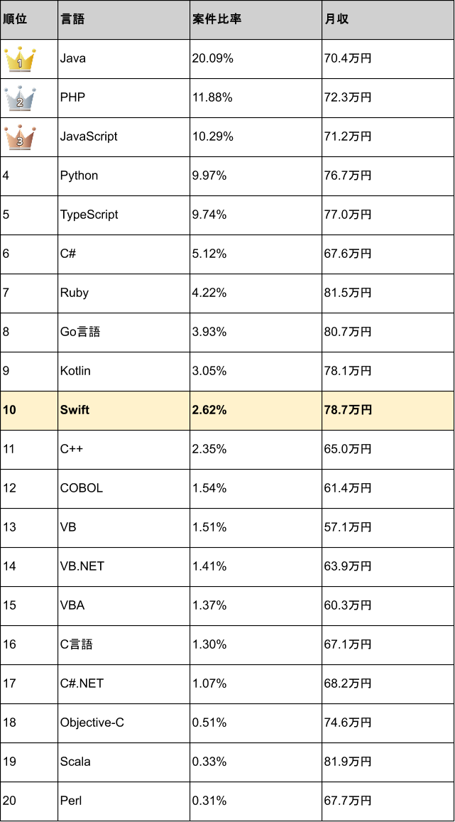 2025年10月時点でSwiftの案件は市場全体の2.62%を占め、案件数は10位、平均月額単価は78.7万円と安定しています。