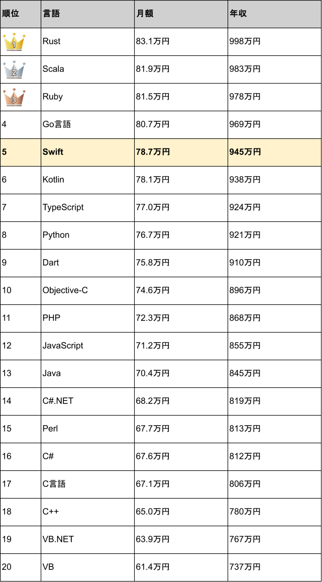 Swift案件の平均月額単価は78.7万円、平均年収は945万円で、プログラミング言語別の年収ランキングでは5位に位置しています。