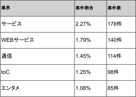 2025年10月時点のSwift案件は、サービスが2.27%(178件)で1位、Webサービスが1.79%(140件)で2位、通信が1.45%(114件)で3位、toCが1.25%(98件)で4位、エンタメが1.08%(85件)で5位となり、上位5業界で全体の約7.8%を占めています。