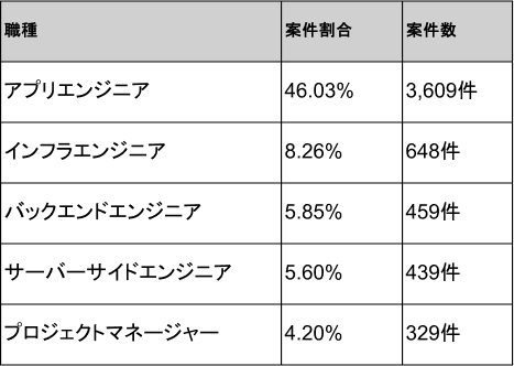 一方、インフラやバックエンド、サーバーサイドの職種が一定の割合を占めるのは、Swiftで開発されたモバイルアプリと連携するAPI基盤やインフラ環境の構築・運用を担う案件が含まれているためと考えられます。