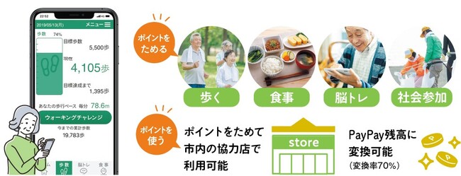 2021年より、『脳にいいアプリ』は八王子市と連携し実証実験中です。実証事業参加者がアプリの提示する適切な運動・食事目標を達成した場合や、市が定めるイベントやボランティア参加など社会参加した場合に“健康”ポイントである『てくポ』が付与されます。『てくポ』は、地元エリアの店舗で利用でき、自治体に住む高齢者の健康促進・介護予防と地元での消費活動の活性化をミッションにした取り組みとなります。既に3,000人以上が『てくポ』に登録しており、高齢者ユーザーの新規開拓の土壌が既に整備されていることから、本研究においても協働することに至りました。