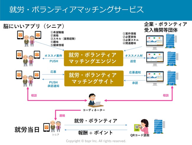 脳にいいアプリには、ユーザーの「健康情報」の他に「過去の就労実績・スキル・趣味」などの情報を保持します。その情報に適した地域企業や団体からの就労・ボランティア情報を配信し、マッチングする事で、高齢者の活躍の場を増やすことを目的とした就労・ボランティアマッチングエンジンおよびマッチングサービスを開発します。
