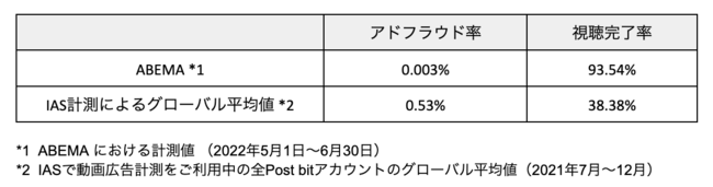 今回のIAS計測の対応に際し「ABEMA」のCTV広告を2ヶ月間テスト計測したところ、IASによる動画広告の世界平均値と比較して、アドフラウド率は約177分の1、広告視聴完了率は約2.4倍高い結果となりました。