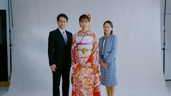 今回、當真さんが出演する新ブランドムービーは、京都きもの友禅の店舗で、親娘が「はじめて」の振袖選びをする様子を描いたストーリーとなっています。来たる晴れの日に向けてお気に入りの一着を試着する娘(當真さん)の姿に、今まで共に過ごしてきた色々な「はじめて」の瞬間を重ね、思い出す母の心情が穏やかに描かれています。華やかな振袖を前に目を輝かせる當真さんの、初々しい表情にご注目ください。