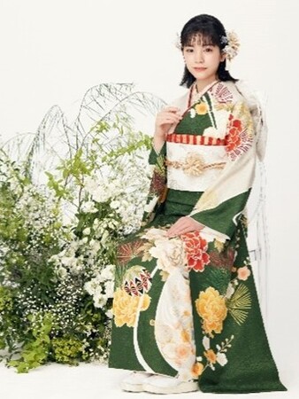 京都きもの友禅のカタログに初出演の當真さん。今回は、手絞り刺繍や辻が花・京友禅などの、當真さん自身のフレッシュさや美しさが際立つ計6柄を着用いただき、清らかさと優美さを表現しました。背景は“edenworks”主宰のフワラーアーティスト篠崎恵美さんにご協力いただき、色鮮やかな花々でクリエイションしたセットを作成していただきました。美しい振袖と、色鮮やかな花々がマッチした華やかなビジュアルをお楽しみください。