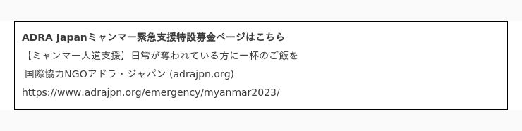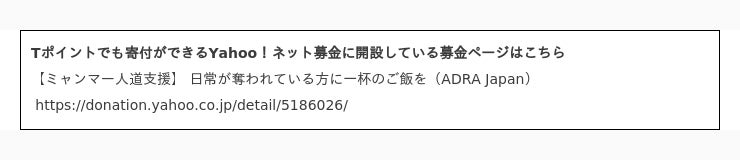 認定NPO法人ADRA Japan (アドラ・ジャパン、 所在地:東京都渋谷区神宮前1-11-1 理事長:柴田俊生)は、紛争により影響を受けた人が増えている中、命をつなぐ食料支援を届ける資金を募る「ミャンマー緊急支援」のYahoo!ネット募金ページを新たに公開しました。
