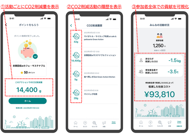 本年度はユーザーの環境配慮行動の実践に応じた「CO2排出量の削減効果」を見える化する機能を追加(下図、赤点線部分)。ユーザーは、自らの環境配慮行動の実績や、参加者全員で削減したCO2によって低減した社会コスト(※5)を確認できます。
