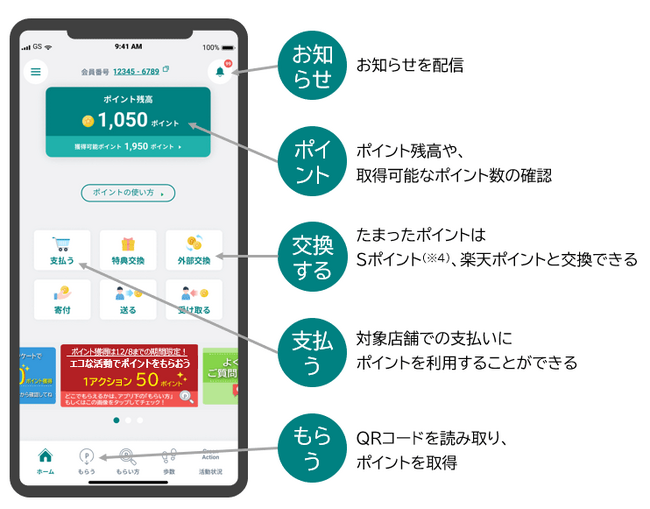 ※4 Sポイントは、阪急阪神グループの施設等で利用できるポイントサービスです。本実証では、Sポイント対象カードのうち「阪急阪神おでかけカード」限定で、グリーンアクションポイントをSポイントに交換できます。