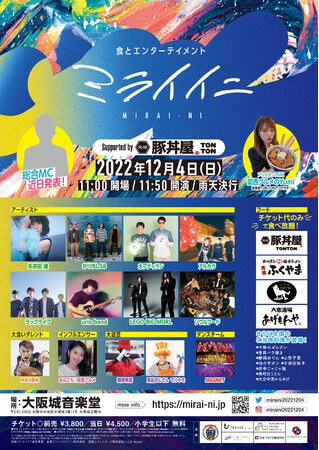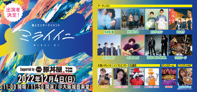 大衆居酒屋「大衆酒場あげもんや」や帯広豚丼「元祖豚丼屋TONTON」など飲食FCを展開するワンズトライン株式会社(本社:大阪市北区芝田2丁目3番16号、代表取締役:山内仁)が、12月4日(日)大阪・大阪城音楽堂(大阪市中央区大阪城3番11号 大阪城公園内)にて開催する、食とエンタメの祭典『ミライイニ』の出演者が決定いたしました。