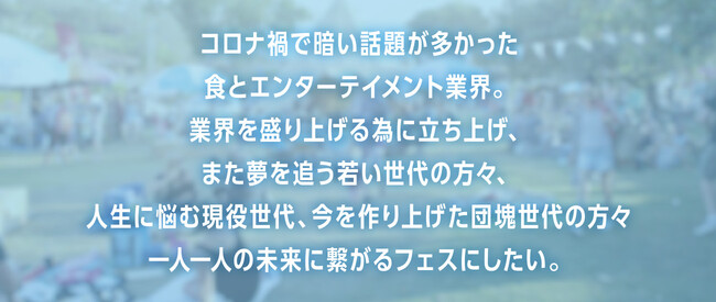コロナ禍で暗い話題が多かった食とエンターテイメント業界。業界を盛り上げる為に立ち上げ、また夢を追う若い世代の方々や人生に悩む現役世代、今を作り上げた団塊世代の方々など、一人一人の未来に繋がるフェスを目指しています。