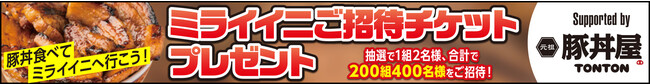 「元祖豚丼屋TONTON」完全サポートで、10/1(土)〜11/15(火)の期間中、1組2名様の招待チケットが合計200組400名様に当たるキャンペーンを行っております。