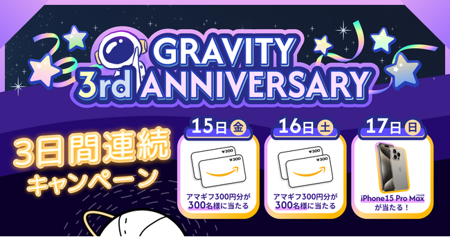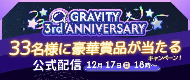 また、3周年当日の17日(日)には抽選で合計33名様に豪華賞品が当たる「GRAVITY3周年記念」公式配信もGRAVITY内音声ルームにて開催予定です。ぜひ皆様のご参加をお待ちしています!