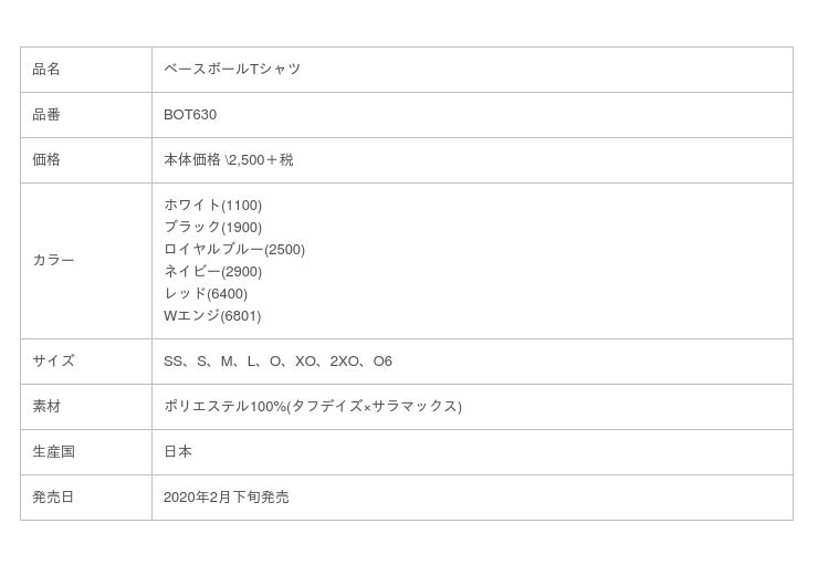【ベースボールTシャツ(BOT630)】の開発ポイントは以下の4点です。