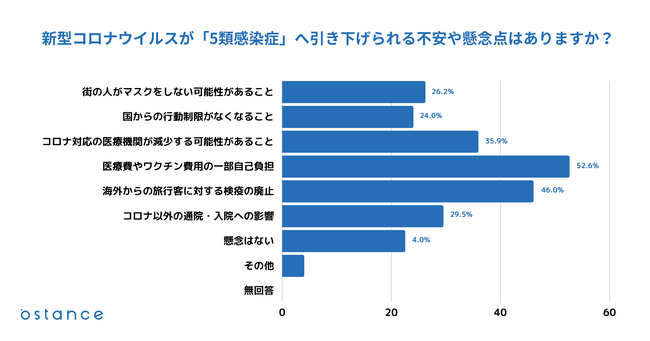5類引き下げへの不安や懸念点については、医療費の自己負担が最も多い52.7%。次いで海外からの旅行客に対する検疫の廃止、いわゆる水際対策がなくなることに対する不安が46.0%という結果になりました。