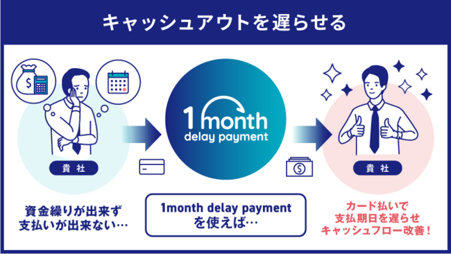 決済機能を利用したBtoB後払いサービスです。このサービスを使って企業が取引先への支払いを行う場合、約30〜50日出金を遅らせることができます。