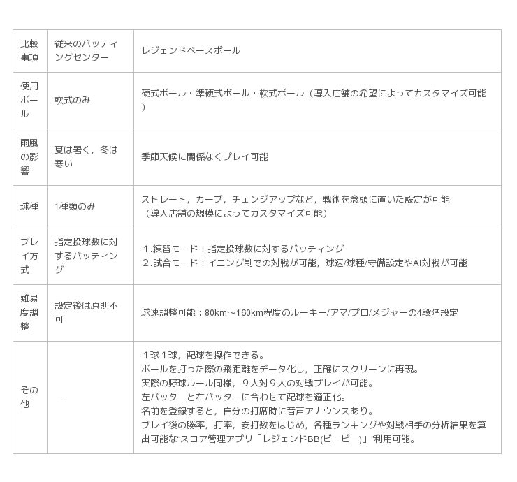 レジェンドベースボール株式会社(本社:東京都新宿区、代表取締役社長 山内恵一)は、日本製紙グループの日本製紙総合開発株式会社(本社:東京都北区、社長:山本哲哉)が運営する東京都北区王子駅前の複合商業施設サンスクエア内バッティング・リニューアルオープンでの主要コンテンツに、展開する体験型スポーツマシン「レジェンドベースボール」を含む4種5機が採用、2018年12月21日(金)11時からの営業開始をお知らせいたします。