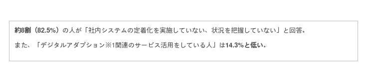 「職場・プライベートでのデジタルサービスの活用に関する調査」を公開 約8割が社内システムの定着化の実施、状況を把握をしていないと回答 各企業において社内システムが定着化できていない実情が浮き彫りに