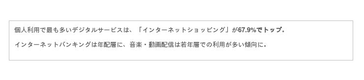 個人利用で最も多いデジタルサービスは、「インターネットショッピング」が67.9%でトップ。