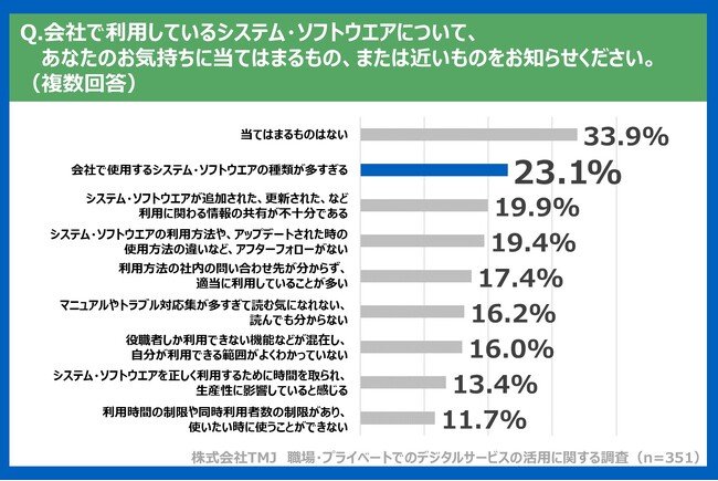 お勤め先でシステム・ソフトウエアを利用している人と回答した人を対象に、会社で利用しているシステム・ソフトウエアについて当てはまる気持ちを聞いたところ、約7割(69.1%)が何かしら不満を持っていることが分かりました。そして、不満に関する選択肢の中から「会社で使用するシステム・ソフトウエアの種類が多すぎる」(23.1%)が最も多い回答となりました【図4】 。