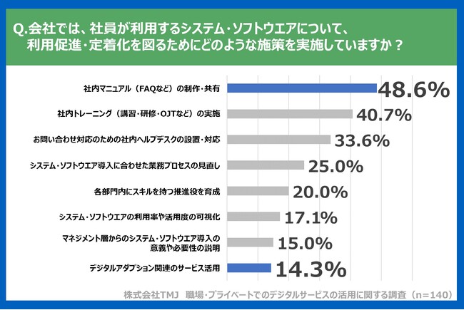 会社で社員が利用するシステム・ソフトウエアについて、利用促進・定着化を図るための施策を実施しているに「はい」と回答した方を対象に、どのような施策を実施していますか聞いたところ、社内マニュアル(FAQなど)の制作・共有(48.6%)が最も多く、デジタルアダプション※1関連のサービス活用(14.3%)が最も少ない回答となりました【図7】。システム・ソフトウエアの利用促進・定着化を図るための施策は、利用方法に関する取り組みが上位にあがっており、外部サービスを使うまでに至っていないことが分かりました。