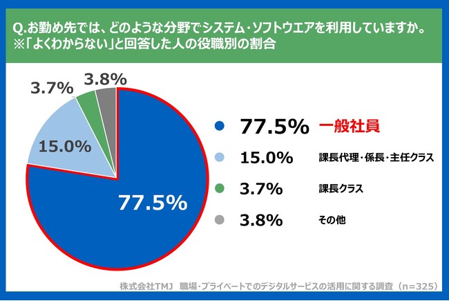 お勤め先でどのような分野でシステム・ソフトウエアを利用していますかと聞いたところ、利用している(43.9%)が最も多く、よくわからない(40.6%)、使っていない(15.5%)と回答しました【図1】。また、よくわからないと回答している人を役職別の割合で見ると、一般職員(77.5%)が多く 、次に、課長代理・係長・主任クラス(15.0%)、課長クラス(3.7%)となりました。役職が高い人ほどわからないという回答が低くなっており、一般職員は社内のシステムやソフトウエアについて理解できていないことがあると推察されます【図2】。