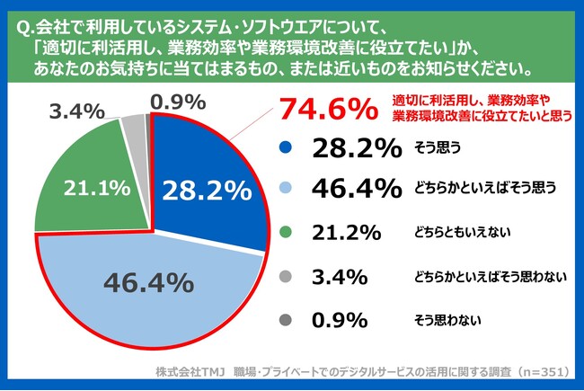 また、会社で利用しているシステム・ソフトウエアを使用する目的について聞いたところ、業務効率や業務環境改善に役立てたい人(そう思う+どちらかといえばそう思う)は74.6%となりました【図5】。