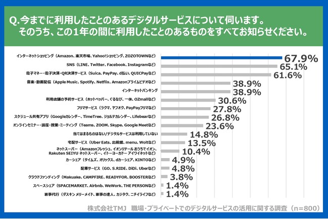 プライベートで利用しているデジタルサービスの利用状況と定着化の実態についても調査を実施。直近1年間で利用したことのあるデジタルサービスについて聞いたところ、1位:インターネットショッピング(67.9%)、2位: SNS(65.1%)、3位電子マネー・電子決済・QR決済サービス(61.6%)と回答しました【図8】。