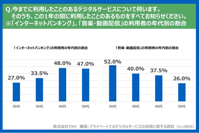 インターネットバンキングは年配層に、音楽・動画配信は若年層での利用が多い傾向に。