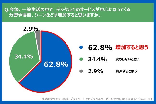 また、今後、一般生活の中で、デジタルでのサービスが中心になってくる分野や場面、シーンなどは増加すると思うか聞いたところ、増加する(62.8%)が最も多く、変わらない(34.4%)、減少する(2.9)という結果になりました【図11】。